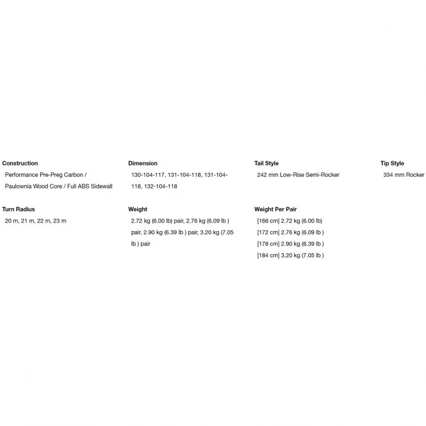 Ottime prestazioni, controllo e movimenti fluidi su ogni tipo di neve sono possibili grazie alla costruzione leggera con un layup in fibra di carbonio, pareti laterali in ABS e core in legno di paulonia. Il flex morbido e la sua rigidità torsionale ti garantiscono una sciata affidabile e reattiva in discesa, mentre la larghezza della punta e della coda migliorano il galleggiamento e l’efficienza su neve fresca.