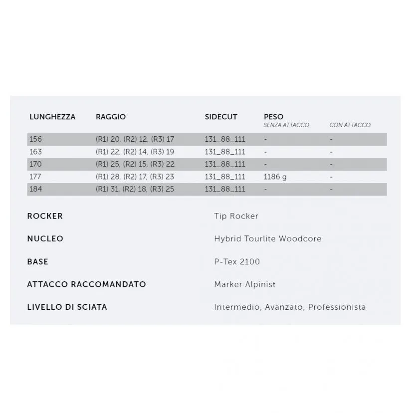 Gli attacchi, solo in questo caso, sono già montati sugli sci e sono regolati per uno scarpone con lo scafo che va dai 306 ai 322mm.